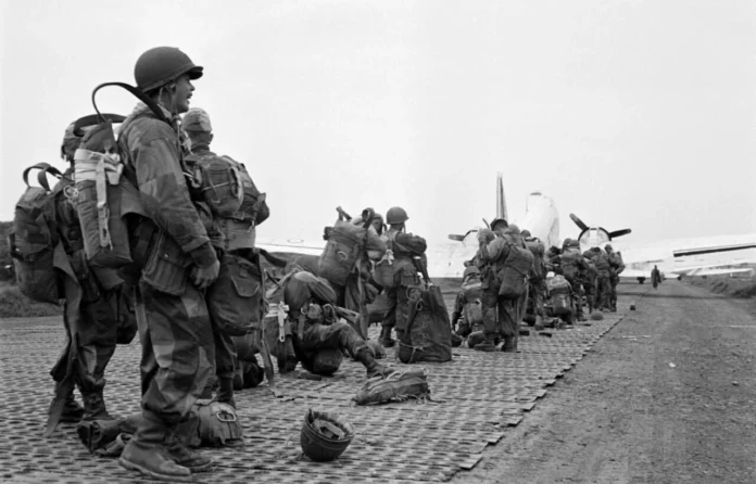 Dans une semi-obscurité, les Dakota sont alignés sur le parking où règne l’effervescence qui précède les missions Banjo. Les sticks de paras qui sauteront dans quelques heures, de nuit, dans la fournaise de Diên Biên Phu, se préparent.